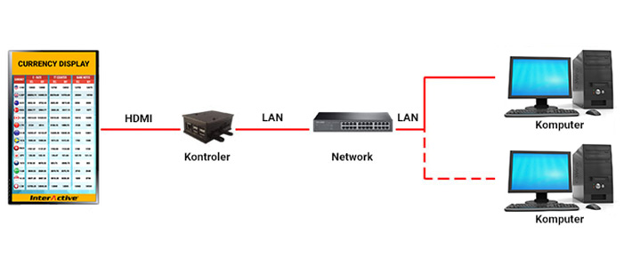 Dalam sistem ini terdapat sebuah kontroler yang dihubungkan dengan jaringan LAN. Bentuk atau fisik dari Kontroler ini sangat minimalis sehingga bisa diletakkan pada bagian belakang Display Utama, dengan tambahan bracket untuk kontroler yang sudah termasuk dalam paket. Dengan begitu bisa menghemat ruang dan menjadi lebih terlihat sangat ringkas dan rapi. Edit nilai bisa dilakukan di semua PC yang terdapat dalam satu jaringan LAN dengan kontroler dan sudah terinstal web browser.