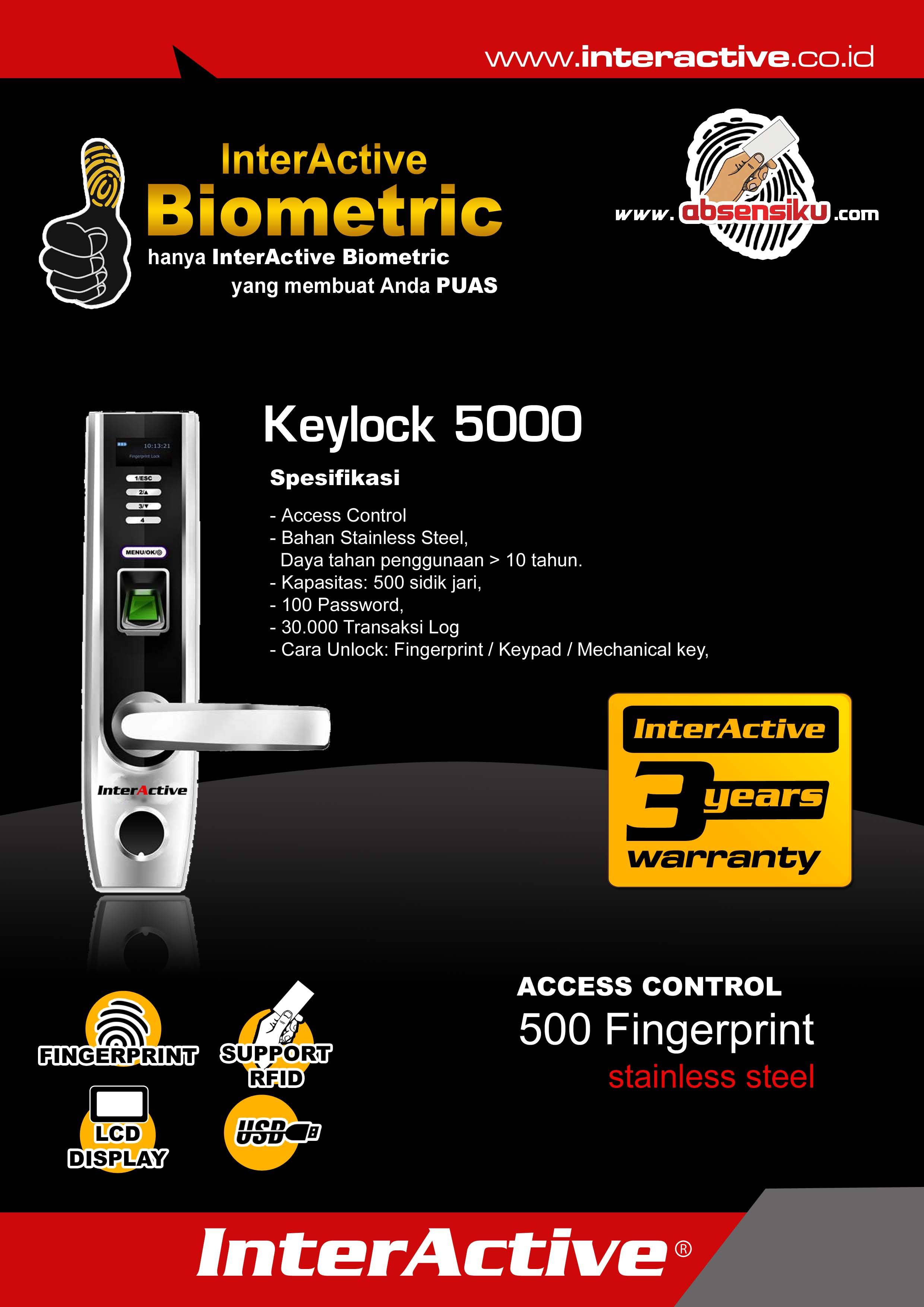 keylockMesin akses kontrol pintu yang sudah berbentuk handle pintu, sangat mudah dalam pemasangan karena tidak membutuhkan kabel listrik, alat ini beroperasi hanya dengan 4 unit battery biasa saja. Mesin ini juga telah di lengkapi dengan LCD Display untuk memudahkan Navigasi dan USB Disk Port untuk Penarikan Data Transaksi melalui USB Flash Disk. Alat ini cocok digunakan untuk jenis pintu kayu. Sensor sidik jari yang digunakan dapat membaca segala jenis sidik jari bahkan yang tersulit sekalipun.