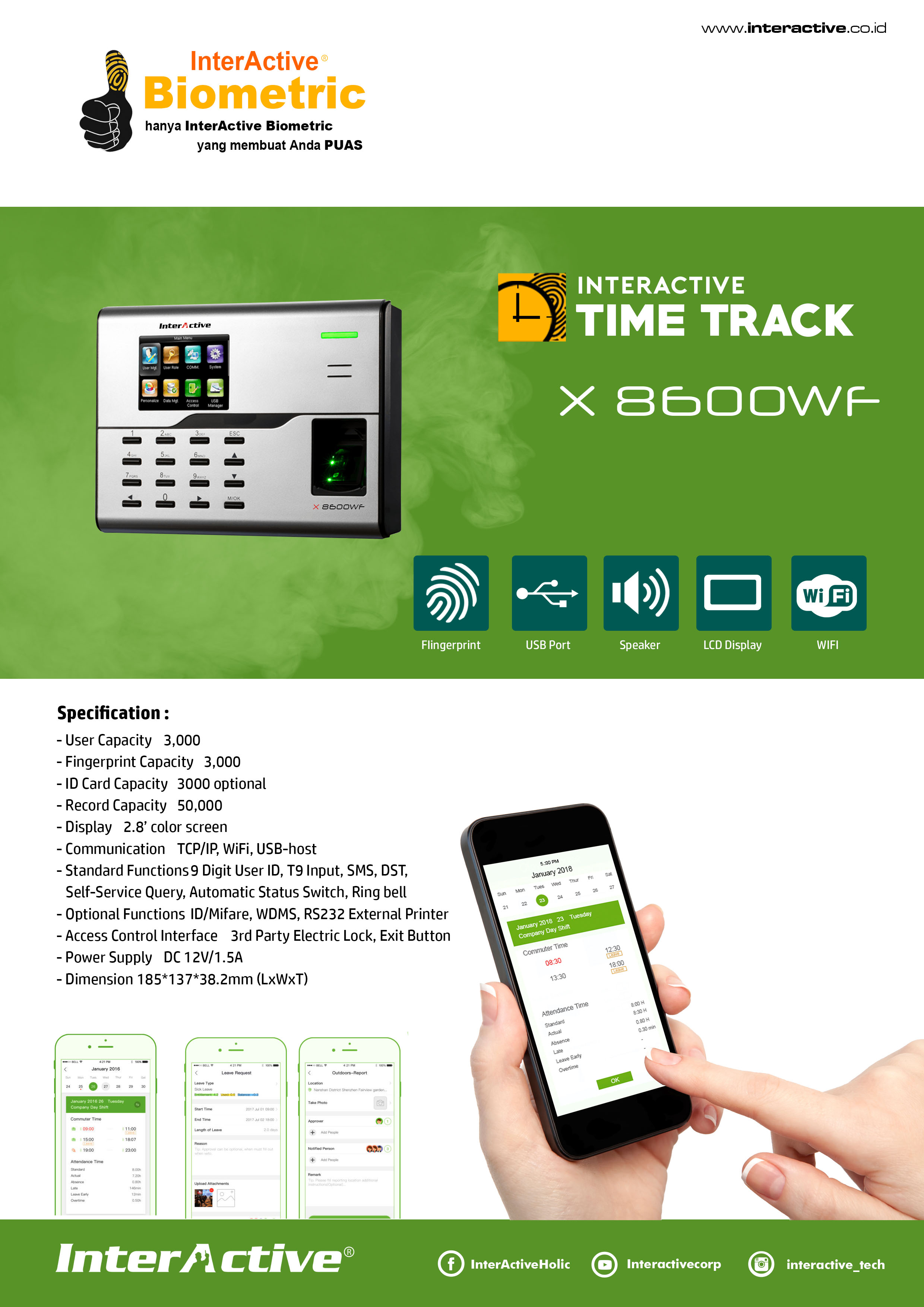 Absensi WifiInterActive X 8600 WF biometrik layar warna 2,8 inci untuk Waktu & Kehadiran, dan aplikasi Access Control. Ini mengadopsi kolektor sidik jari BioID untuk pengenalan yang sangat baik dan WiFi internal untuk komunikasi yang nyaman. Pengguna dapat mengatur data melalui TCP / IP, WiFi, dan port host USB untuk Pengambilan data / unduh untuk menghindari risiko penghapusan tidak disengaja.